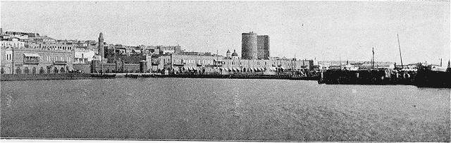 La situation particulière de Bakou devait, en outre, favoriser dans une rare mesure les actes de vandalisme. Cette cité de 120.000 âmes, bâtie sur la rive occidentale de la mer Caspienne, est le centre de l'industrie pétrolière du Caucase. Autour de la ville, à Bibi-Eybat, à Surakhany, et surtout à Balakhany dont nous donnons une vue générale, s'élèvent, innombrables, les pyramides de bois ou derricks, à l'intérieur desquelles jaillissent les colonnes de naphte qui se rendent, par des ruisseaux à l'air libre, dans des lacs noirâtres formant de gigantesques réservoirs d'incendie. Il a suffi d'une torche pour changer toute cette région en fournaise et provoquer en quelques heures une centaine de millions de ruines.