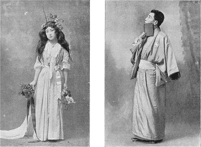 | Sada Yacco dans le rôle d'Oriye, l'Ophélie japonaise: scène de la folie. | Asajiro Fujisawa dans le rôle de Toshimaru Hamura, l'Hamlet japonais. |