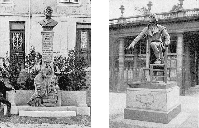 | Monument de Taine, à Vouziers. | Monument de Camille Desmoulins, au Palais-Royal. |