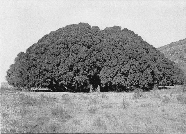 Le fameux figuier de Roscoff, en Bretagne, apparaîtrait comme un chétif buisson auprès de l'arbre phénoménal dont nous donnons ici la vue, et qui ombrage un coin de terre au Transvaal, non loin de Pretoria. Il a 20 mètres de hauteur, 55 de diamètre et 170 de circonférence. Comme le figuier breton, il a plusieurs troncs, et telles de ses branches, retombées vers le sol, y ont pris racine. Mais le pied principal mesure seul 25 mètres de circonférence, et tous ses troncs sont parfaitement solidaires les uns des autres, de sorte qu'il s'agit bien, en réalité, d'un seul arbre.