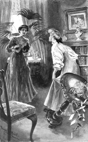 "Why, are you in?" she said innocently, as she entered the room. "I didn't know but what it might be a burglar or something—" She looked from one to the other anxiously, and then catching sight of the overturned table, began to busy herself picking up the scattered ornaments.