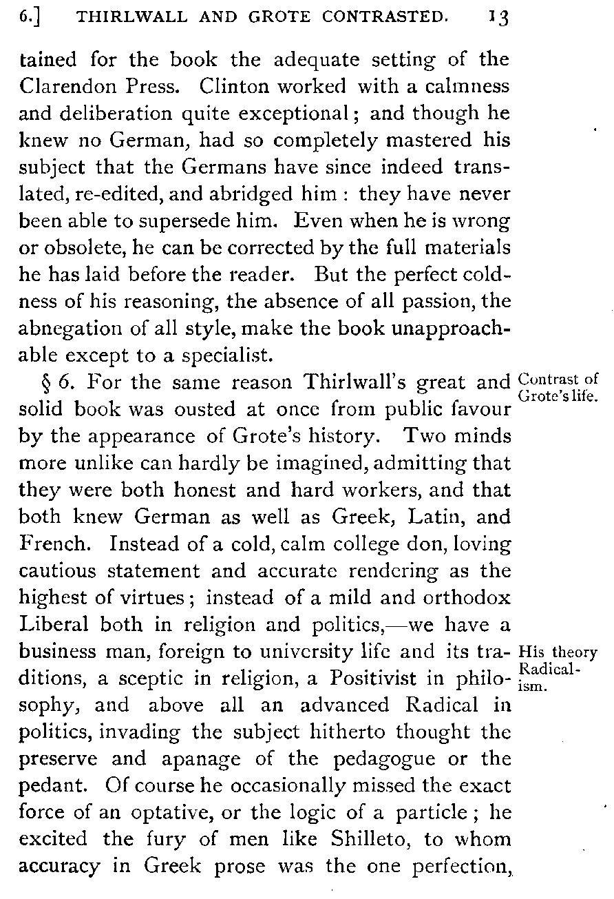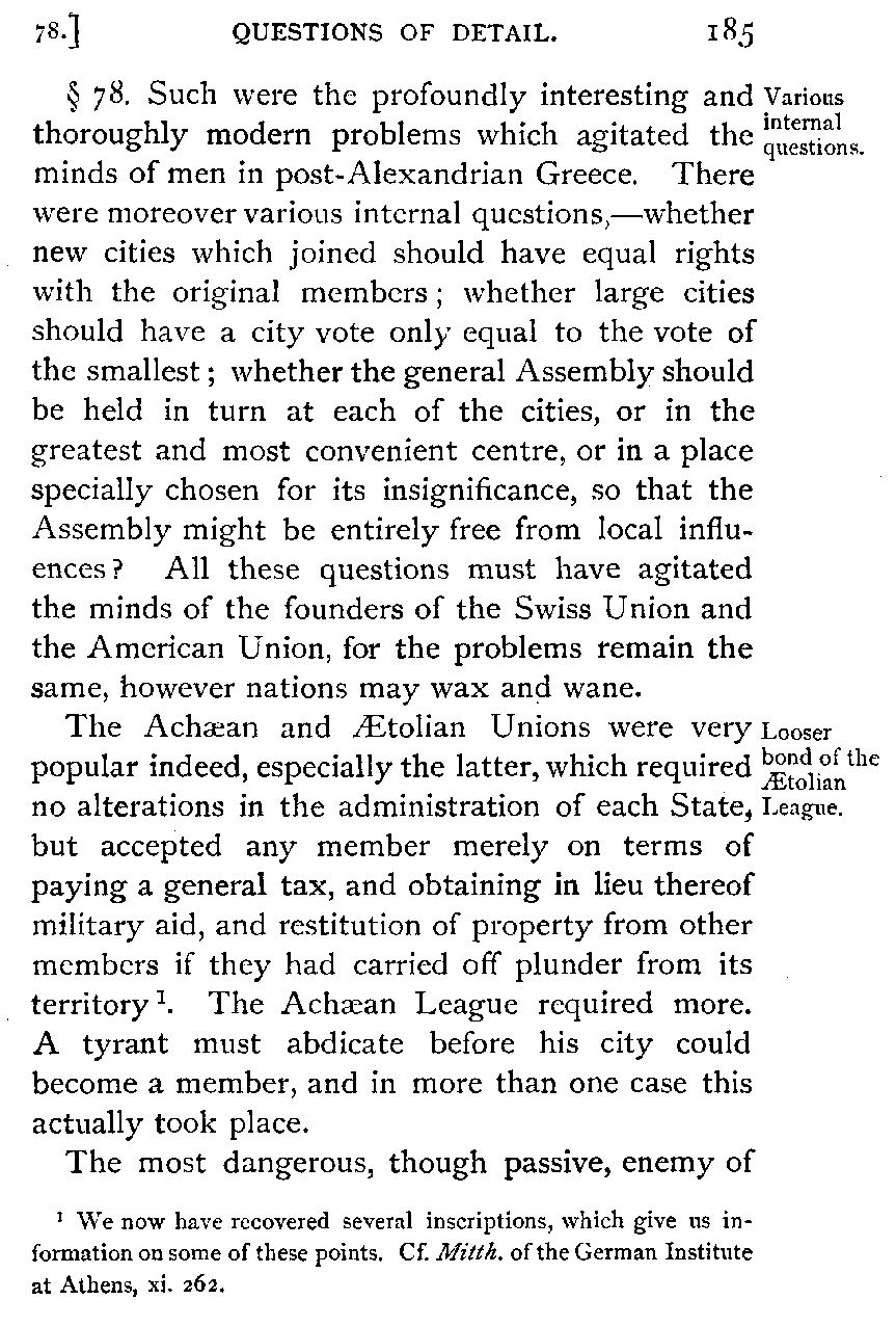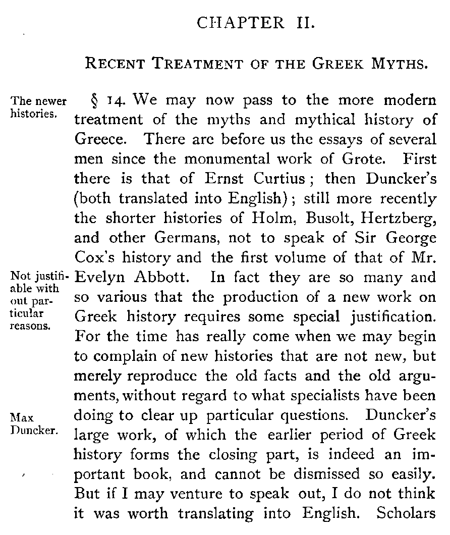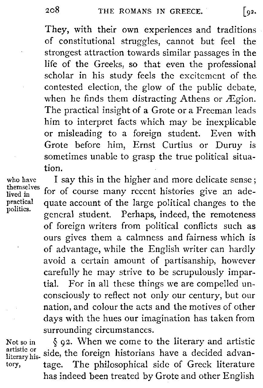 § 91. I said at the opening of this essay that I should endeavour to indicate the principal problems to be solved by future historians of Greece,—at least by those who have not the genius to recast the whole subject by the light of some great new idea; and in so doing, particular stress has been laid on the political side, not without deliberate intention. For, in the first place, this aspect of Greek affairs is the peculiar province of English historians. [208]They, with their own experiences and traditions of constitutional struggles, cannot but feel the strongest attraction towards similar passages in the life of the Greeks, so that even the professional scholar in his study feels the excitement of the contested election, the glow of the public debate, when he finds them distracting Athens or Ægion. The practical insight of a Grote or a Freeman leads him to interpret facts which may be inexplicable or misleading to a foreign student. Even with Grote before him, Ernst Curtius or Duruy is sometimes unable to grasp the true political situation.