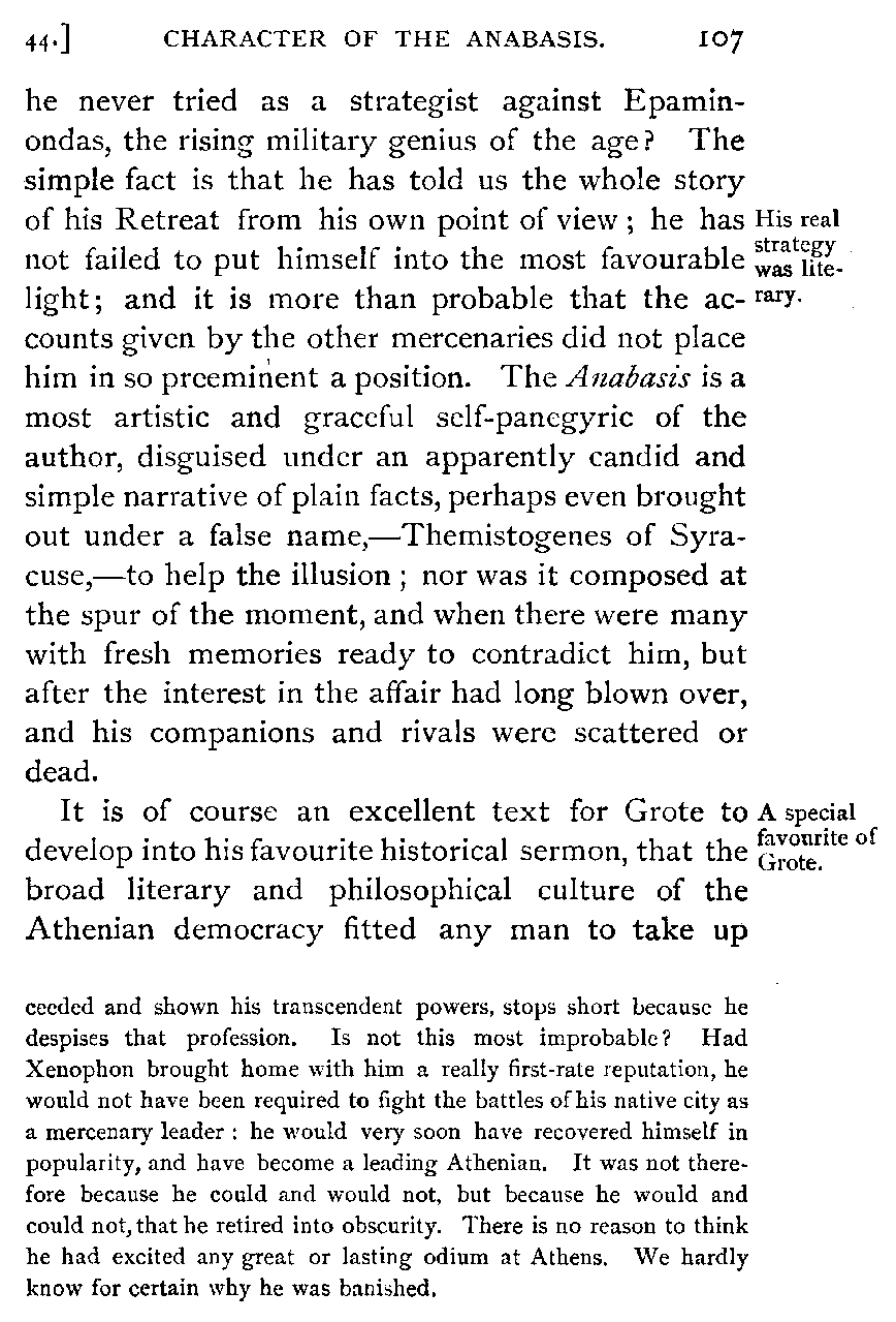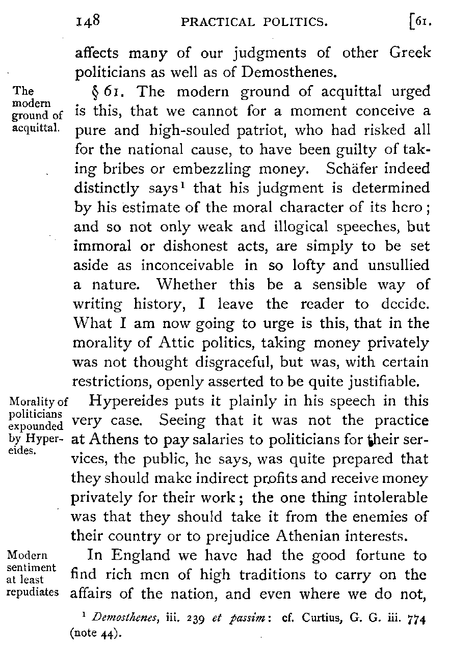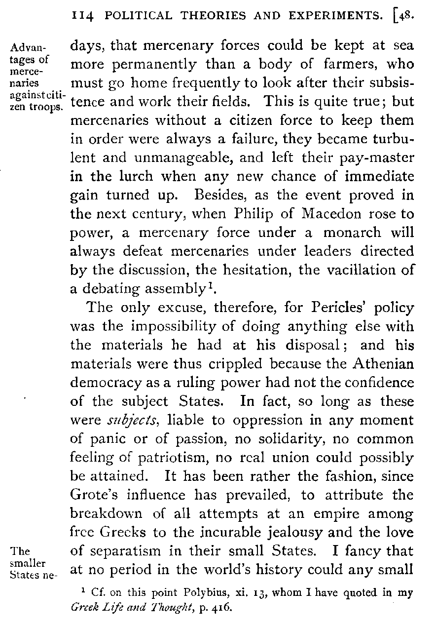 § 91. I said at the opening of this essay that I should endeavour to indicate the principal problems to be solved by future historians of Greece,—at least by those who have not the genius to recast the whole subject by the light of some great new idea; and in so doing, particular stress has been laid on the political side, not without deliberate intention. For, in the first place, this aspect of Greek affairs is the peculiar province of English historians. [208]They, with their own experiences and traditions of constitutional struggles, cannot but feel the strongest attraction towards similar passages in the life of the Greeks, so that even the professional scholar in his study feels the excitement of the contested election, the glow of the public debate, when he finds them distracting Athens or Ægion. The practical insight of a Grote or a Freeman leads him to interpret facts which may be inexplicable or misleading to a foreign student. Even with Grote before him, Ernst Curtius or Duruy is sometimes unable to grasp the true political situation.