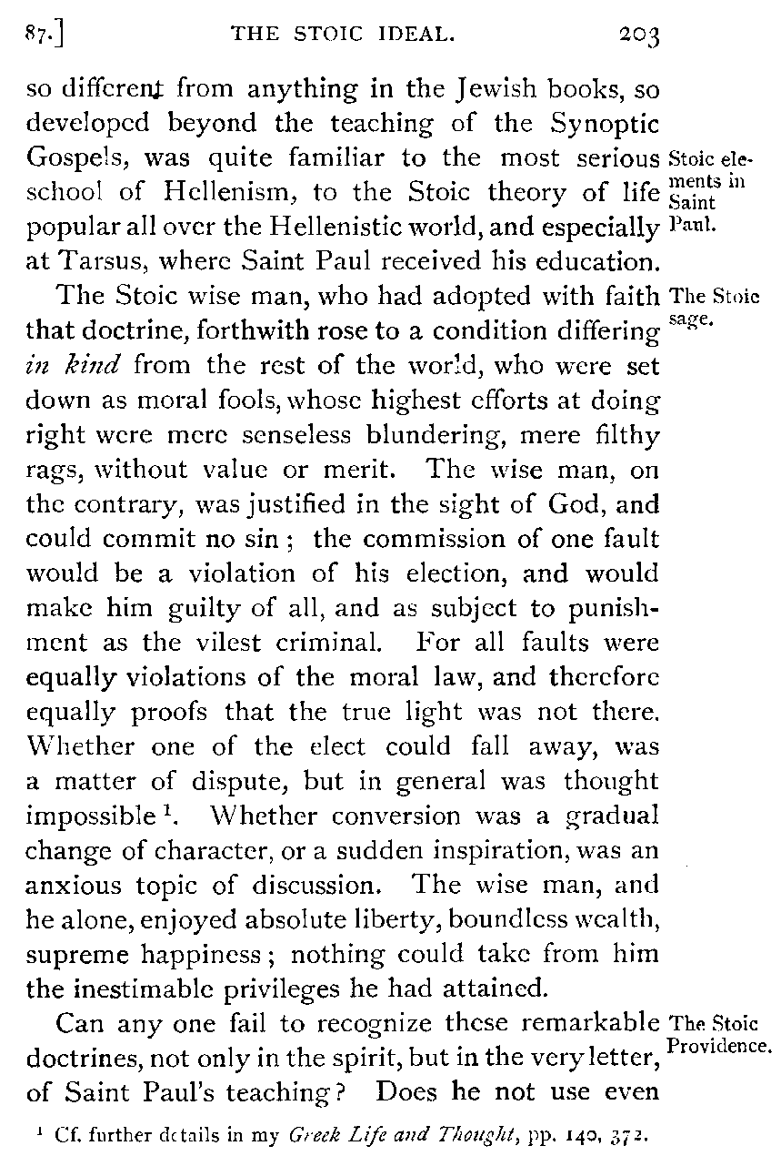 § 87. When we pass by the first three, or Synoptical, Gospels, there remains a series of books by early Christian teachers, of whom Saint Paul and Saint John are by far the most prominent. To Saint Paul is due a peculiar development of the faith which brings into prominence that side of Christianity now known as Protestantism,—the doctrine of justification by faith; of the greater importance of dogma than of practice; of the predestination or election of those that will be saved. This whole way of thinking, this mode of looking at the world, [203]so different from anything in the Jewish books, so developed beyond the teaching of the Synoptic Gospels, was quite familiar to the most serious school of Hellenism, to the Stoic theory of life popular all over the Hellenistic world, and especially at Tarsus, where Saint Paul received his education.