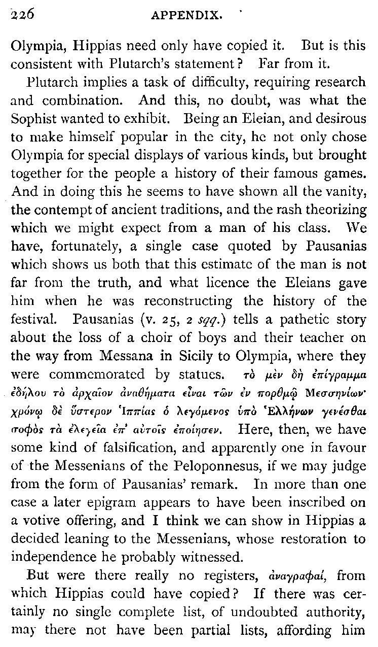 Such then were the materials from which Hippias proceeded, not before the year 400 B.C., and probably a generation later, to compile the full register of the Olympiads. There may have been some old inscriptions which Pausanias failed to see, or which had become [231]illegible, or had disappeared under the soil with time. Doubtless there were many old traditions at Elis, which the Eleian sophist would gather and utilise. There were also throughout Greece, in the various cities he visited, traditions and inscriptions relating to victors who had been natives of these cities. But that these formed an unbroken chain from Corœbus down to Hippias' day is quite incredible.