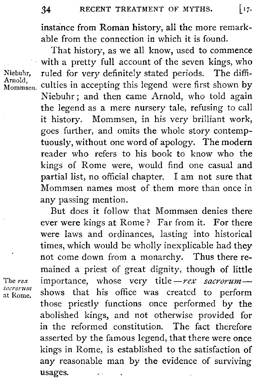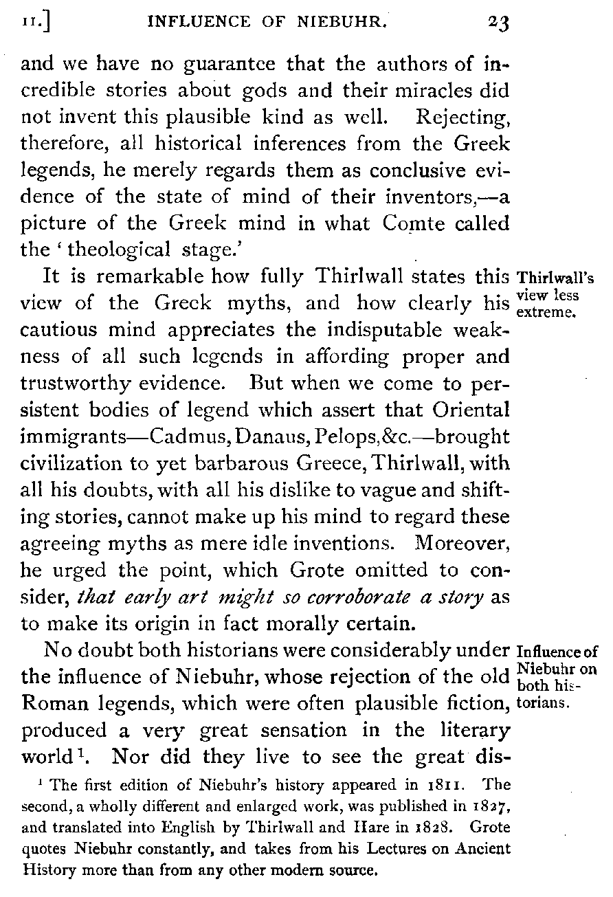 I think the case of Thucydides to be closely analogous to that of Aristotle. On all historical matters within the reach of proper inquiry, I hold him to have been thoroughly critical. But when we go back to the legends such as the Siege of Troy, or the story of Tereus and Procne, I think he laid aside all this caution, and [240]contented himself with a very modest rationalism in interpreting the myths. He is most particular about the Pentekontaetia, and Hellanicus' mistakes, but tells us calmly of events sixty years after the Trojan War, or 300 years before the Greeks went to Sicily. These matters stood with him on a different footing from that of his researches, just as our Bible history is honestly accepted by many scientific men of very sceptical turn in their special studies. They acquiesce in Scriptural evidence as a matter of general consent.