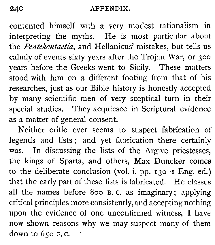 Neither critic ever seems to suspect fabrication of legends and lists; and yet fabrication there certainly was. In discussing the lists of the Argive priestesses, the kings of Sparta, and others, Max Duncker comes to the deliberate conclusion (vol. i. pp. 130-1 Eng. ed.) that the early part of these lists is fabricated. He classes all the names before 800 B.C. as imaginary; applying critical principles more consistently, and accepting nothing upon the evidence of one unconfirmed witness, I have now shown reasons why we may suspect many of them down to 650 B.C.