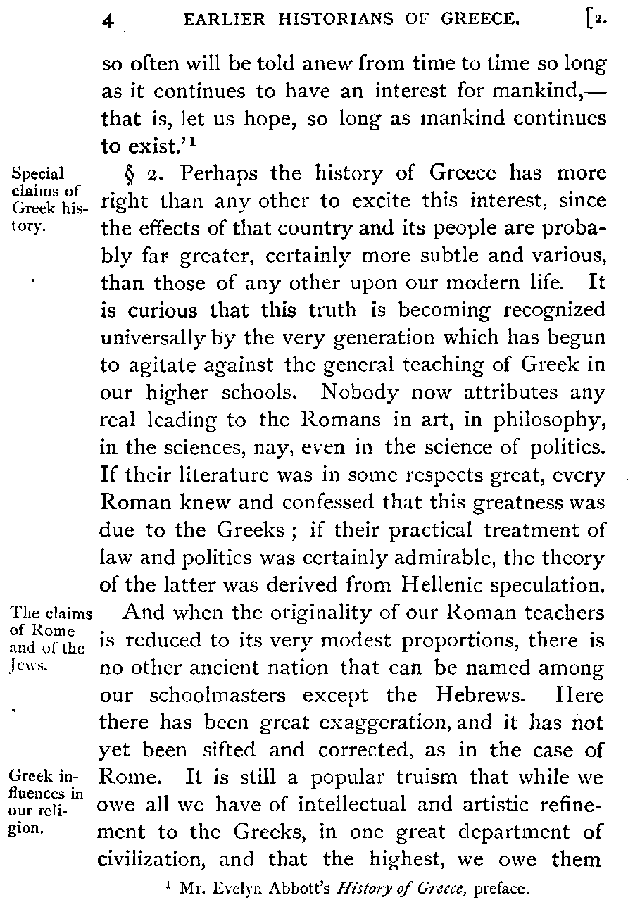 § 92. When we come to the literary and artistic side, the foreign historians have a decided advantage. The philosophical side of Greek literature has indeed been treated by Grote and other English [209]writers with a fulness and clearness that leave little to be desired; but on the poetry and the artistic prose of the Greeks, foreign scholars write with a freshness and a knowledge to which few of us attain. Of course a Frenchman, with the systematic and careful training which he gets in composition, must have an inestimable advantage over people, like us, who merely write as they list, and have no rules to guide their taste or form their style. And the German, if as regards style he is even less happily circumstanced than the Englishman, whose language has at least been moulded by centuries of literature, has yet on the side of archæology and art enjoyed a training which is only just now becoming possible in England or America.