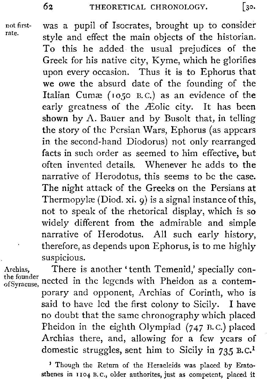 [236]Unfortunately the genealogy of Iphitus is not extant; in Pausanias' day he already had three different fathers assigned to him (v. 4, 6.); and we cannot, therefore, follow out the a priori scheme of Hippias in this instance; but I will illustrate it by another, which still plays a prominent figure in our histories of Greece—I mean the chronology of the Sicilian and Italian colonies, as given by Thucydides in his sixth book. He speaks with considerable precision of events in the latter half of the eighth century B.C.; he even speaks of an event which happened 300 years before the arrival of the Greeks in Sicily. As Thucydides was not inspired, he must have drawn these things from some authority; as he mentions no state documents it has been conjectured that his source was here the work of Antiochus of Syracuse. This man was evidently an antiquarian no wiser or more scientific than his fellows; Thucydides betrays their method by dating all the foundations downwards from that of Syracuse. Antiochus was obliged to admit the priority of Naxos, but grants it only one year; then he starts from his fixed era. But how was the date of the foundation of Syracuse determined? Not, so far as we know, from city registers and careful computations of years backward from the fifth century. Such an assumption is to my mind chimerical, and the source of many illusions. The foundation of Syracuse was determined as to date by its founder, Archias, being the tenth from Temenos. The return of the Herakleidæ was placed before the middle of the eleventh century B.C.; hence Archias would fall below the middle of the eighth century. The usual date of Pheidon of Argos, 747 B.C., was fixed in the same way by his being the tenth Temenid, and hence the 8th Ol. was set down as the an-Olympiad celebrated by [237]him. He should probably, as I have before argued, be brought down nearly a century (to 670 B.C.) in date.