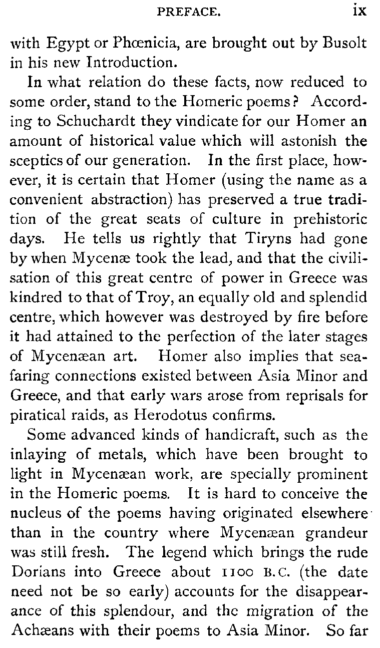 So far the case for the early date and historic basis of Homer seems considerably strengthened by recent research. Nevertheless, the marked contrasts between the Mycenæan Greeks and the society in Homer create a great difficulty. Some of these have been removed by the aid of (perhaps legitimate) ingenuity, but differences of dress, of burial customs, in the use of iron, &c., remain. The seafaring too of the Homeric Greeks does not seem to me at all what we may infer the Mycenæan seafaring to have been. Minos, or [xi]somebody else, must have suppressed piracy, and prehistoric trading cannot have been so exclusively in the hands of the Phœnicians. The Old Mycenæans were perfectly ignorant of the art of writing, a fact which seems to preclude any systematic dealing with the Phœnicians, though Busolt rather infers from it a want of personal intercourse with the Hittites, and a mere reception of Asiatic luxuries through rude and semi-hostile Sidonian adventurers. Busolt thinks we can follow down prehistoric art through its various steps to that which leads into the Homeric epoch, but as yet such a gradual transition seems to me not clearly shown; I cannot but feel a gulf between the two. Either therefore the original poets of the Iliad were separated by a considerable gap of time from the life they sought to describe—there may have been a period of decadence before the Dorians appeared—or the Ionic recension was far more trenchant than a mere matter of dialect, and by omission or alteration accommodated the already strange and foreign habits of a bygone age to their own day; or else the Alexandrian editors have destroyed traces of old customs far more than has hitherto been suspected[xi:1].