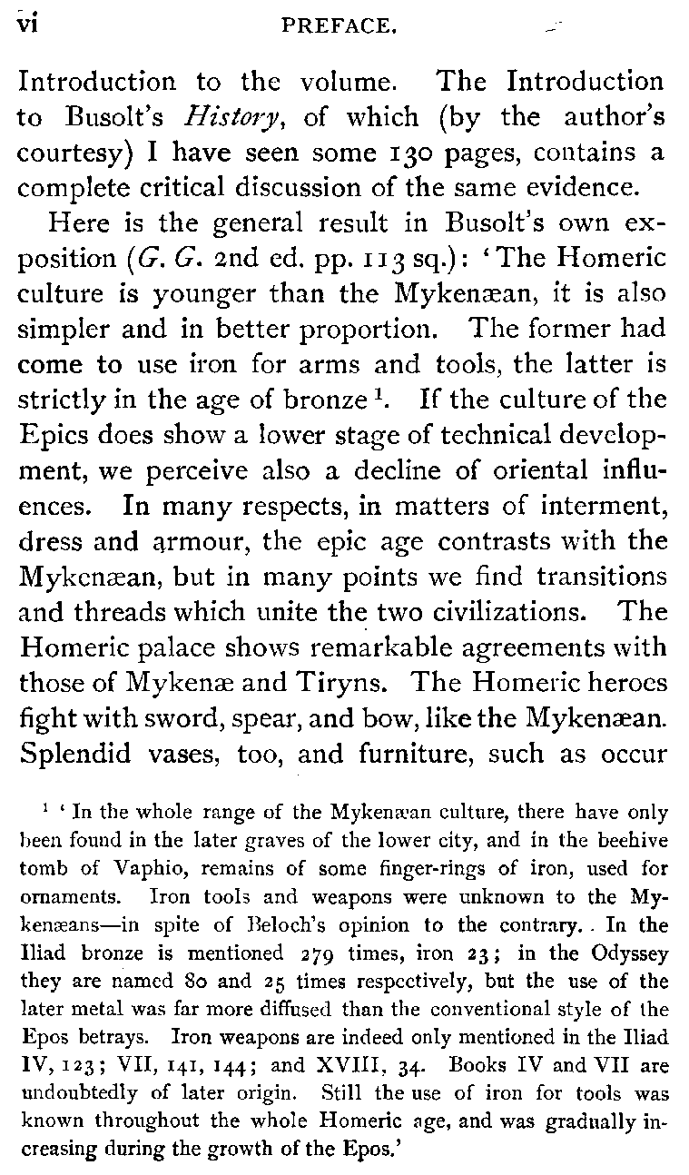 [vi:1] 'In the whole range of the Mykenæan culture, there have only been found in the later graves of the lower city, and in the beehive tomb of Vaphio, remains of some finger-rings of iron, used for ornaments. Iron tools and weapons were unknown to the Mykenæans—in spite of Beloch's opinion to the contrary. In the Iliad bronze is mentioned 279 times, iron 23; in the Odyssey they are named 80 and 25 times respectively, but the use of the later metal was far more diffused than the conventional style of the Epos betrays. Iron weapons are indeed only mentioned in the Iliad IV, 123; VII, 141, 144; and XVIII, 34. Books IV and VII are undoubtedly of later origin. Still the use of iron for tools was known throughout the whole Homeric age, and was gradually increasing during the growth of the Epos.'