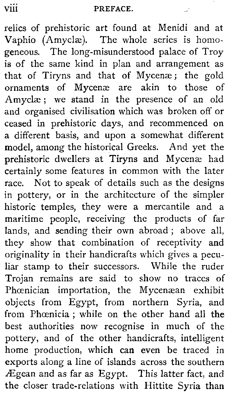 Let us note that the earlier and ruder civilisation of Troy may be contrasted with that of Mycenæ, though both of them show successive stages—the later stage of the (second) city of Troy approaching to the intermediate stage of Tiryns, and indeed, forming an unbroken chain with this, Mycenæ, and even the later and more finished [viii]relics of prehistoric art found at Menidi and at Vaphio (Amyclæ). The whole series is homogeneous. The long-misunderstood palace of Troy is of the same kind in plan and arrangement as that of Tiryns and that of Mycenæ; the gold ornaments of Mycenæ are akin to those of Amyclæ; we stand in the presence of an old and organised civilisation which was broken off or ceased in prehistoric days, and recommenced on a different basis, and upon a somewhat different model, among the historical Greeks. And yet the prehistoric dwellers at Tiryns and Mycenæ had certainly some features in common with the later race. Not to speak of details such as the designs in pottery, or in the architecture of the simpler historic temples, they were a mercantile and a maritime people, receiving the products of far lands, and sending their own abroad; above all, they show that combination of receptivity and originality in their handicrafts which gives a peculiar stamp to their successors. While the ruder Trojan remains are said to show no traces of Phœnician importation, the Mycenæan exhibit objects from Egypt, from northern Syria, and from Phœnicia; while on the other hand all the best authorities now recognise in much of the pottery, and of the other handicrafts, intelligent home production, which can even be traced in exports along a line of islands across the southern Ægean and as far as Egypt. This latter fact, and the closer trade-relations with Hittite Syria than [ix]with Egypt or Phœnicia, are brought out by Busolt in his new Introduction.
