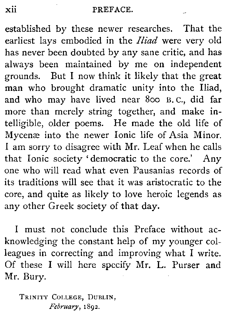 It does not therefore appear to me that the antiquity of the Homer which we possess is materially [xii]established by these newer researches. That the earliest lays embodied in the Iliad were very old has never been doubted by any sane critic, and has always been maintained by me on independent grounds. But I now think it likely that the great man who brought dramatic unity into the Iliad, and who may have lived near 800 B.C., did far more than merely string together, and make intelligible, older poems. He made the old life of Mycenæ into the newer Ionic life of Asia Minor. I am sorry to disagree with Mr. Leaf when he calls that Ionic society 'democratic to the core.' Any one who will read what even Pausanias records of its traditions will see that it was aristocratic to the core, and quite as likely to love heroic legends as any other Greek society of that day.
