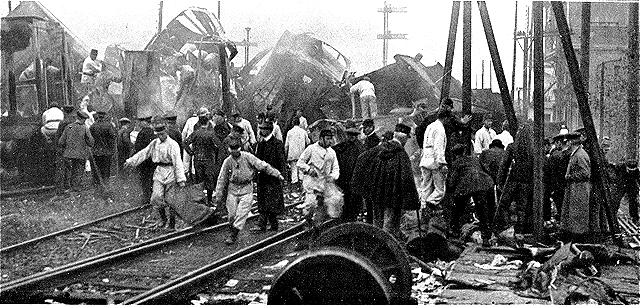 Nos photographies donnent une impression saisissante de l'aspect effroyable que présentaient les voies pendant le déblaiement. Jamais, croyons-nous, dans les catastrophes antérieures de chemin de fer, on ne vit un train aussi fracassé et, en contemplant cet amoncellement de ferrailles, on s'étonne que le nombre des victimes ne soit pas encore plus considérable.