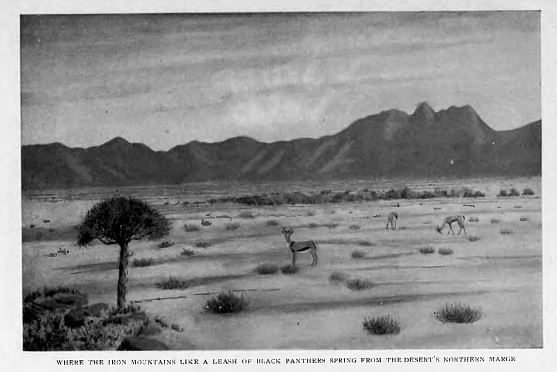 The country surrounding Silverfontein was wild and rugged. Long, dyked ridges, foam-tipped with snow-white quartzite rocks, stretched away to infinity, north and south; here and there a naked granite finger pointed to the cloudless sky. On the western side these ridges seemed to break like waves against the enormous bronze-hued bastions of the Kamiesbergen; on the eastward they sank by degrees into the ocean-like expanse of the desert.
