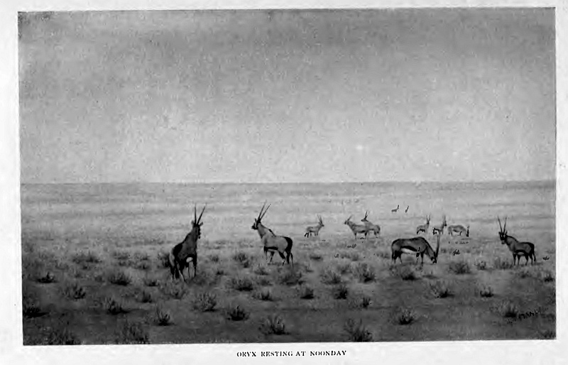 The lordly oryx crossed our path; the ungainly hartebeest lumbered away to windward at a pace which made pursuit hopeless; the gazelles of the desert fled before us like thistledown borne on an eddying wind. The roofs of many a city of desert mice sank beneath our footsteps and the horned adder hissed defiance at our caravan from his home at the tussock’s base. We crossed the zig-zag track made by the yellow cobra when prowling in the darkness. The plumed ostrich scudded away at our approach, the great bustard of the Kalihari spread his powerful wings and flew forth heavily until he almost crossed the horizon, and the “kapok vogeltje,” no bigger than a wren, twittered at us from his seat of cunning on the outside of the simulated snowball which is his nest.