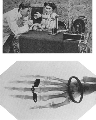 Two of my early experiences may be of interest to you. The first of these seemed to me a rather tame affair. Our X-ray tube appeared to be arranged for the amusement of fashionable folk. One grand lady placed her hand behind the fluorescent screen, whereupon we produced an image of the bones of her hand and very dark images of all the many rings upon her fingers. Several of the rings had enormous diamonds, but it was after she had gone away that I overheard two gentlemen speaking about the rings. One asked the other if he had observed the beautiful diamonds, whereupon the other roared with laughter. It seems that we proved them to be imitation diamonds, for our rays could not penetrate them, whereas they have no difficulty in passing through real diamonds. We therefore produced black shadows of the imitation diamonds. Little did the grand lady know how we had exposed her sham jewels.