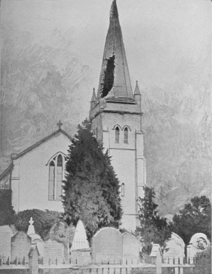 When a myriad of electrons is discharged suddenly from a cloud to the earth, it happens sometimes that considerable damage is done. The above photograph is of a church steeple damaged by lightning in 1875. No lightning-conductor was provided, so the electrons had to get to earth by way of the steeple itself, with the disastrous result as shown.