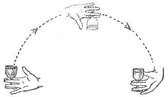 Now pick up a jug of water with your right hand and throw a large handkerchief over your right arm. With the left hand take a tumbler from the table, pour some water into it, and take it with the disengaged fingers of the right hand, so that with your left hand you can take the handkerchief from your right arm and throw it over the glass.