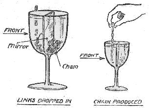 In this trick the conjurer fills a tumbler or goblet with water and drops in a number of links from a chain. (A small brass curtain chain which has been pulled to pieces answers well for the trick.) The conjurer "fishes" into the tumbler with a long buttonhook and gets hold of one of the links; all the others come with it, because the links are joined together.