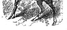 The valiant riders scour the country hither and thither, far and near, "gathering beef" from east, west, north, and south. Every hoof found, regardless [335] of the brand it bears, or whether it bears any, is picked up by this human cyclone and carried along. Toward noon the herds already gathered are driven into the branding pens, where they are corraled. The calves are snatched out and the "jimption is socked to 'em," as the boys express it. So with any yearlings or older stock that have escaped the branding-iron in former seasons. One or more irons for each owner are kept hot, and when a roper has "downed" an animal he or the foreman calls for the iron wanted, and setting his foot upon the victim's neck places the red-hot device on its ribs, and throws his weight upon it, leaving a deep, indelible, and time-enduring trade-mark which even he who runs may read. Its ears, dew lap, or the loose skin on its jaw are then slit and it is turned loose again.
