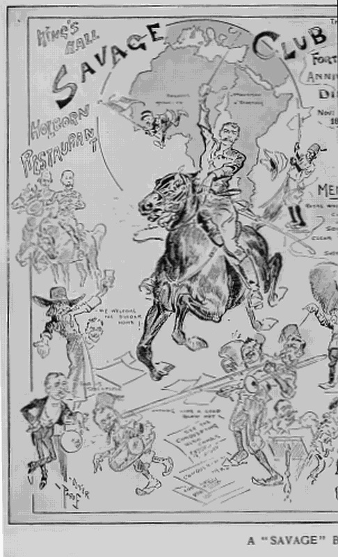 It has long been the custom here to invite to dine at the social Saturday evening gathering pretty well everyone who has become famous, and whose name is upon the public lips, and these invitations have been accepted by warrior and statesman, by our greatest artists and travellers, whether they have sought to discover the Boreal mysteries or to cross the Torrid Zone. Even those who have become great rulers have not disdained to accept “Savage” hospitality, and upon such nights some popular or distinguished member of the club is called upon to take the chair. Now it so happens that there is extant a copy of the menu of a dinner, drawn by one of the cleverest members, which depicts in quaint, characteristic, and light-hearted fashion the imaginary proceedings and post-prandial entertainment connected with the aforesaid unstrung bow. In the case in question Lord Kitchener was the guest, fresh from his victories in the Sudan, and no better chairman could have been chosen than the popular war correspondent, George Henty, whose portrait and that of the famous general occupy the centre of the dinner card represented here.