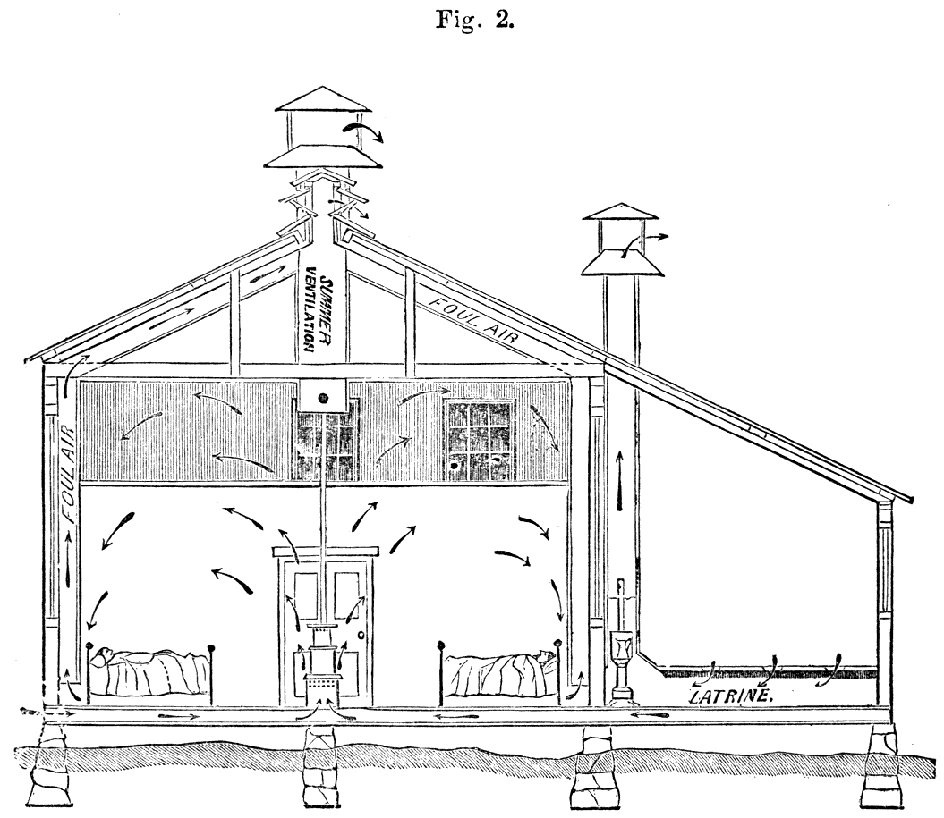 In fact, when completed with the ventilation as above described, with the abundant sunlight on both sides, without any obstructing partitions and abundantly warmed in winter, and with the proper supply of moisture, they made undoubtedly the most comfortable and wholesome class of buildings, as a whole, that have ever been erected for hospital purposes, not excepting even many of the recent elaborately finished buildings, where not unfrequently too much dependence has been placed on the very meagre and insufficient effect produced by attempts at artificial ventilation, instead of relying more upon the great natural means of ventilation—an abundance of large open windows, open fires and good ventilating stoves.