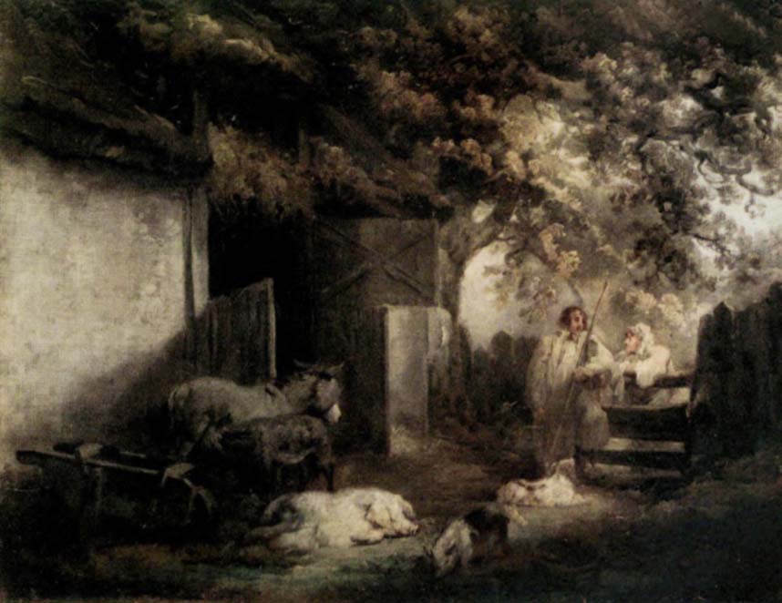 Morland's art embraced great variety of subjects. His earlier popular successes were achieved by his figure paintings, and of these it is worth noticing that among the best were pictures which pointed morals he studiously ignored in his own career. The great popularity of W. R. Bigg's pictures of child-life led the dealers to persuade Morland to take up the same line of work, and in his pictures of child-life the artist shows himself what we know him to have been—a lover of children and one who had perfect understanding of them. The insight with which he portrayed children is only equalled by that which distinguishes his animal paintings. Morland's horses, ponies, asses, calves, and pigs, are entirely his own; they possess a character which stamps them as the work of one who had almost uncanny knowledge. He rarely painted a well-bred horse; the animal that appealed to him was the farmer's work-horse or the slave of the carter, and on these he expended his greatest skill. Only an artist who was also a horseman could paint the horse as he painted it. He has been described as a "pig painter," but this refers rather to the success with which he proved the artistic possibilities of subjects so unpromising than to the number of works in which pigs occur, though it is admitted that he was fond of painting such pictures. His asses and calves, in their kind, are equal to his horses; cows he seldom painted, and when he essayed to do sheep he was not conspicuously successful.