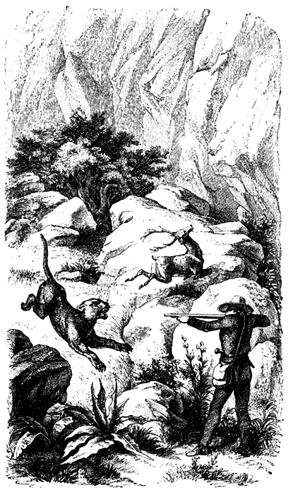 It was one of those mild southern spring nights when man feels beneath the star-enamelled vault of heaven that he is nowhere better in health or stronger than in the open air. The odour of the flowers had sunk upon the earth with the motionless air, and the glistening insect world sparkled and flashed like streams of diamonds from the dark shade of the evergreen shiny foliage. Lying round our small camp-fire, we were soon lulled to sleep by the feathered songsters of the night, among which the mocking-bird appealing to its mate was the most remarkable, and we negligently allowed the last flames to die out; but at a late hour we were startled by the roar of a jaguar close to us, and on awaking we recognised the sound of flying horses. We ran to our cattle, and only found Czar and John's mare, snorting and dragging at their bonds, while the Indian's horse and Lasar's mule had bolted, and we heard Trusty barking down the glen. We quickly blew up our fire, and threw fresh wood on it; but the damage was done, and we might reckon with certainty on the loss of one if not both beasts. We spent the rest of the night on the watch, and just as day dawned, and we had breakfasted I rode accompanied by Trusty, down the glen, while John and the Indian proceeded to the mountains in search of our fugitives. Only Lasar remained in camp, as walking through the grass was too fatiguing for him. I followed the foot of the hills, along which ran a stream overshadowed by yuccas, tree-like aloes, gigantic cactuses, palms and mimosas, and had ridden about four miles, following the tracking dog, when the latter showed me on the clayey bank on which no grass grew the hoofmarks of our mule and the imprints of a jaguar running down to the stream. Not long after, on riding round a projecting clump of shrubs, I noticed in the grass Lasar's mule, and upon it an enormous jaguar, which appeared to be asleep, as its golden-spotted body lay stretched out and motionless. I led Czar back into the bushes, and then crept down the stream nearer to the beast of prey, until I concealed myself within shot in a tuft of old mimosa trees, from which I could survey it. Laying my rifle on a low branch, I aimed at the centre of the brute's back, which was turned toward me, as its head rested on the mule. I fired, the jaguar sprang up, but fell on its side immediately, and while uttering an awful roar, looked about the valley in search of its assailant. It was unable to rise on its hind-legs, and strove to drag itself on its forepaws to the adjacent water. I had reloaded in the meantime, and stepped out of my hiding-place on to the grass plot. The jaguar now saw me, its fury increased with every step I took, and dragging itself toward me it made the hills ring with its savage roars. I walked pretty nearly up to it, and put an end to its life with a bullet through the head; then I went to Lasar's mule, whose belly was slit up, and one of its legs devoured. The jaguar must have caught it up while running, for on its croup I found numerous wounds where the beast had buried its claws.