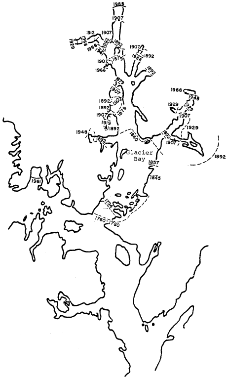 Glacier Bay is located near the north end of the Alexander Archipelago (Figures 1 and 2). The Bay opens into Cross Sound and Icy Strait of the Inside Passage of southeast Alaska. When Vancouver discovered the area in 1780, glacial ice filled the Bay to its mouth (Figure 3). In 1891, when the Bay was first mapped, Muir Inlet was still filled with ice. Today the ice has retreated up the right (Muir Inlet) arm of the "Y" shaped Bay to tide-water levels. Recently, glacial ice has started to readvance in the upper reaches of the west inlets of the Bay.