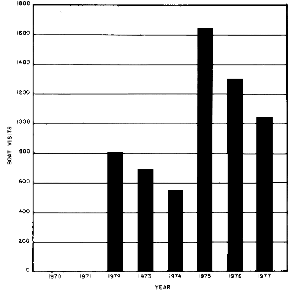Commercial fishing vessel activity in the Bay was probably low until the 1970's. Since 1972 (it is not known whether data are available prior to 1972) commercial fishing vessel visits have fluctuated (Figure 4), but fishing activity has been greatest during the summer months (Figure 5). Sport fishing visits have increased during the same time period (Figure 6).