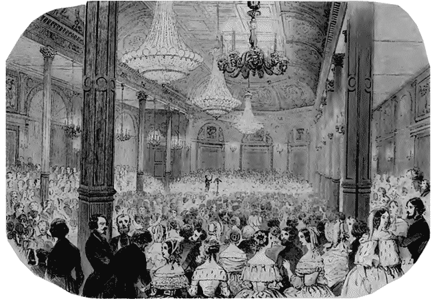 C'est M. Henri Herz, l'habile et célèbre pianiste qui en est propriétaire, et qui l'a fait construire il y a peu d'années. Elle n'a rien de commun avec celle du conservatoire, dont nous faisions remarquer naguère l'extrême simplicité. Celle-ci au contraire, est brillante, somptueuse et tout à fait mondaine, de vives peintures la décorent; d'élégantes arabesques l'enveloppent de leurs replis onduleux; l'or y étincelle de toutes parts, à la clarté de mille bougies.... Mais que vais-je faire, essayer de la peindre avec des paroles? Dieu m'en préserve! Pour en donner au lecteur une idée complète. L'Illustration a des moyens bien plus sûrs que la description la plus exacte et la plus détaillée.