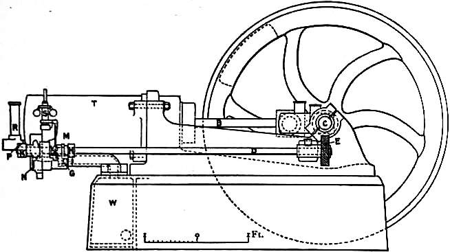 Four-cycle Engines.—Otto-cycle engines belong to the third type, being explosion engines in which the combustible mixture 497 is compressed previous to explosion. Fig. 1 is a side elevation, fig. 2 is a sectional plan, and fig. 3 is an end elevation of an engine built about 1892 by Messrs Crossley of Manchester, who were the original makers of Otto engines in Great Britain. In external appearance it somewhat resembles a modern high-pressure steam engine, of which the working parts are exceedingly strong. In its motor and only cylinder, which is horizontal and open-ended, works a long trunk piston, the front end of which carries the crosshead pin. The crank shaft is heavy, and the fly-wheel large, considerable stored energy being required to carry the piston through the negative part of the cycle. The cylinder is considerably longer than the stroke, so that the piston when full in leaves a space into which it does not enter. This is the combustion space, in which the charge is first compressed and then burned. On the forward stroke, the piston A (fig. 2) takes into the cylinder a charge of mixed gas and air at atmospheric pressure, which is compressed by a backward stroke into the space Z at the end of the cylinder. The compressed charge is then ignited, and so the charge is exploded with the production of a high pressure. The piston now makes a forward stroke under the pressure of the explosion, and on its return, after the exhaust valve is opened, discharges the products of combustion. The engine is then ready to go through the same cycle of operations. It thus takes four strokes or two revolutions of the shaft to complete the Otto cycle, the cylinder being used alternately as a pump and a motor, and the engine, when working at full load, thus gives one impulse for every two revolutions. The valves, which are all of the conical-seated lift type, are four in number—charge inlet valve, gas inlet valve, igniting valve, and exhaust valve. The igniting valve is usually termed the timing valve, because it determines the time of the explosion. Since the valves have each to act once in every two revolutions, they cannot be operated by cams or eccentrics placed directly on the crank shaft. The valve shaft D is driven at half the rate of revolution of the crank shaft C by means of the skew or worm gear E, one wheel of which is mounted on the crank shaft and the other on the valve shaft. Ignition is accomplished by means of a metal tube heated to incandescence by a Bunsen burner. At the proper moment the ignition or timing valve is opened, and the mixed gas and air under pressure being admitted to the interior of the tube, the inflammable gases come into contact with the incandescent metal surface and ignite; the flame at once spreads back to the cylinder and fires its contents, thus producing the motive explosion.