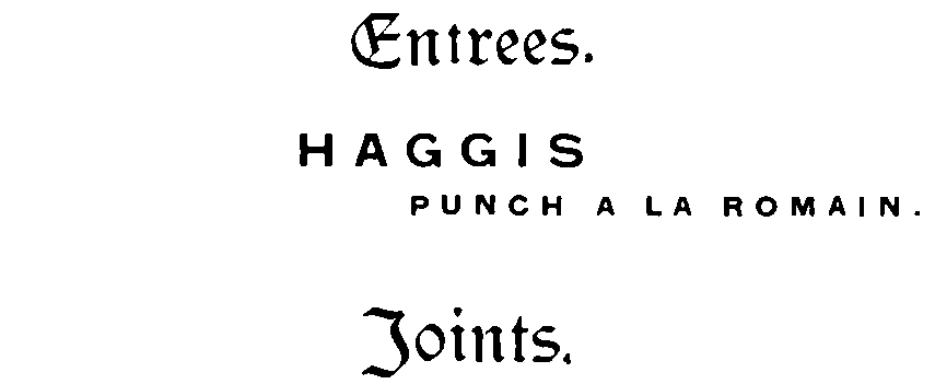 HE second Annual Gathering and Dinner of the Clan Fraser in Canada was held on the 25th day of February, 1895, that date having been selected in honor of the Scots' victory at Roslin on February 25th, 1303, when the army was commanded by Sir Simon Fraser, the patriot (p. 48). The place of meeting was the Rossin House, Toronto. The gentlemen were accompanied by lady friends, a departure from the custom generally observed on similar festive occasions, that contributed greatly to the pleasure of the evening. The committee in charge of the arrangements was composed of Dr. J. B. Fraser (Chairman of Programme Committee), Professor W. H. Fraser, Messrs. G. B. Fraser, R. L. Fraser, Alexander Fraser (Fraserfield), Alexander R. Fraser, W. P. Fraser, Andrew Fraser, Alexander Fraser (MacFhionnlaidh), Chairman; and W. A. Fraser, Secretary. Those present were Rev. Dr. Mungo Fraser, Hamilton; Mr. W. Lewis Fraser, New York; Mr. Donald Fraser, Kingston; Mr. R. I. Fraser, Barrie; Mr. Andrew Fraser, Barrie; Messrs. Robert Lovat Fraser, George B. Fraser, and Miss Fraser; Professor W. H. Fraser and Mrs. Fraser; Dr. J. B. Fraser and Mrs. Fraser; Alexander Fraser (Fraserfield), Mrs. Fraser and Miss Kate Fraser; Alexander R. Fraser and Mrs. Fraser; Alexander Fraser (MacFhionnlaidh), Mrs. Fraser, Miss Fraser, Mrs. Georgina Fraser-Newhall, and Mrs. Ramsay; Mr. W. A. Fraser and Mrs. Fraser; Dr. Pyne and Mrs. Pyne; Alexander Fraser[Pg 108] (Parkdale), and Miss Fraser; W. P. Fraser, Donald Fraser, Charles Fraser, Mrs. C. G. Fraser and Master Norman Fraser, James Fraser, Henry Sandham Fraser.