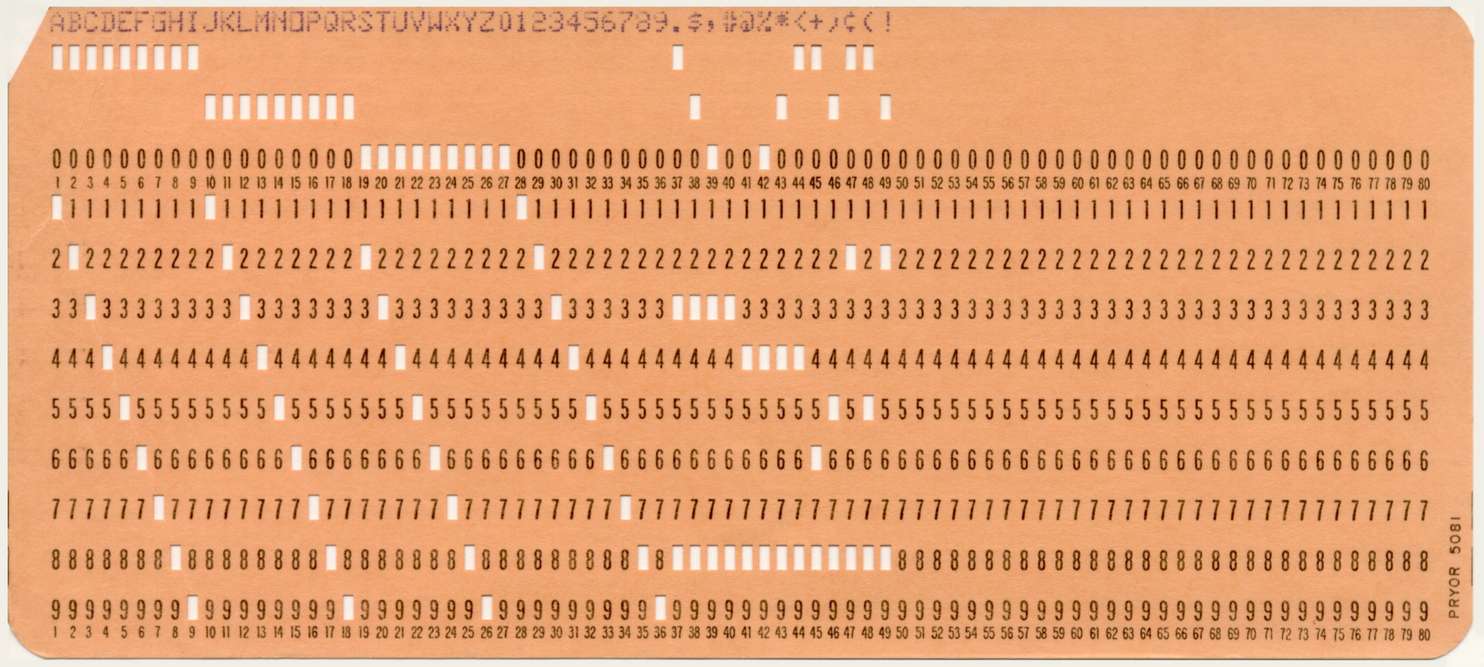The front of the keypunch card is labelled vertically along the right-hand edge: PRYOR 5081. Holes punched in the card are represented in the text by [].