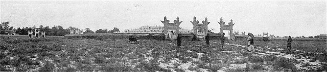 Ce Temple du Ciel, relativement récent, est d'une majesté incomparable. Il a ceci de particulier que, contrairement aux autres monuments chinois, ses bâtiments sont distribués sur de larges espaces suivant une vaste ordonnance qui fait songer à Versailles, tandis que le Palais d'Été, par exemple, donne une sensation de fouillis, d'entassement et de lourdeur. Ici, ce sont de grandes lignes, de somptueuses compositions, et les détails les plus minutieux de l'ornementation se tiennent sagement dans l'ampleur de cet ensemble admirablement décoratif.