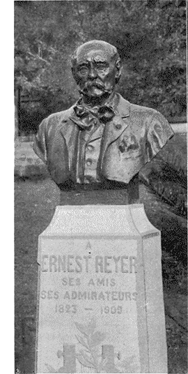 Le soin de faire revivre dans le bronze la belle figure d'Ernest Reyer, si fin d'esprit et de coeur sous ses dehors de militaire bourru, à la rude moustache, a été confié au sculpteur Denys Puech, de l'Institut: il a exprimé avec bonheur ce que cette mâle apparence cachait de naturelle bonté. Le buste est placé sur un piédestal carré en pierre grise, qui porte, au-dessus d'une lyre traversée d'une palme, une simple dédicace.