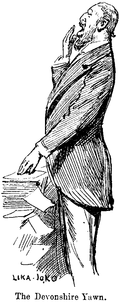 For the ladies in the gallery, mothers and daughters, Devonshire not so attractive a parti as was Hartington. Still, he is a pillar of the Union, a brand snatched from the burning pile to which the wicked hand of Mr. G. applied the traitrous torch. So they sat and listened—half an hour, three-quarters of an hour, an hour. Then was heard the light rustle of dainty dresses; doors softly opened along the Gallery; for a moment a fair figure stood framed in it, with guilty glance around to see if she was observed; then, with winning "back-in-five-minutes" look on innocent face, she hastily stepped out.