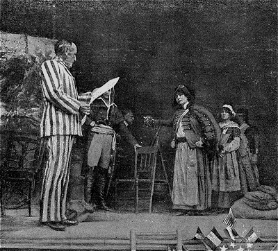 Chaque scène se termine au milieu de frénétiques bravos et de sifflements stridents (aux États-Unis, en effet, le sifflet, contrairement à notre coutume, marque l'approbation suraiguë des spectateurs). Les répliques finales des acteurs sont échangées dans un enthousiasme extraordinaire. Le spectacle achevé, un prisonnier s'avance sur la scène et remet à Sarah Bernhardt une mélodie qui lui est dédiée par ses camarades, intitulée: Par delà le sommet des collines. Il lui offre en même temps un bouquet de violettes et prononce, en français, l'allocution suivante, qui vaut d'être reproduite textuellement: