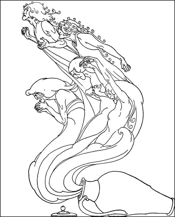 Still upon his lyre he played. Tantalus—who, for his crimes, had been condemned to stand up to his neck in water and yet never be able to assuage his thirst—Tantalus heard, and for a while did not strive to put his lips toward the water that ever flowed away from him; Sisyphus—who had been condemned to roll up a hill a stone that ever rolled back—Sisyphus heard the music that Orpheus played, and for a while he sat still [pg 271] upon his stone. And even those dread ones who bring to the dead the memories of all their crimes and all their faults, even the Eumenides had their cheeks wet with tears.