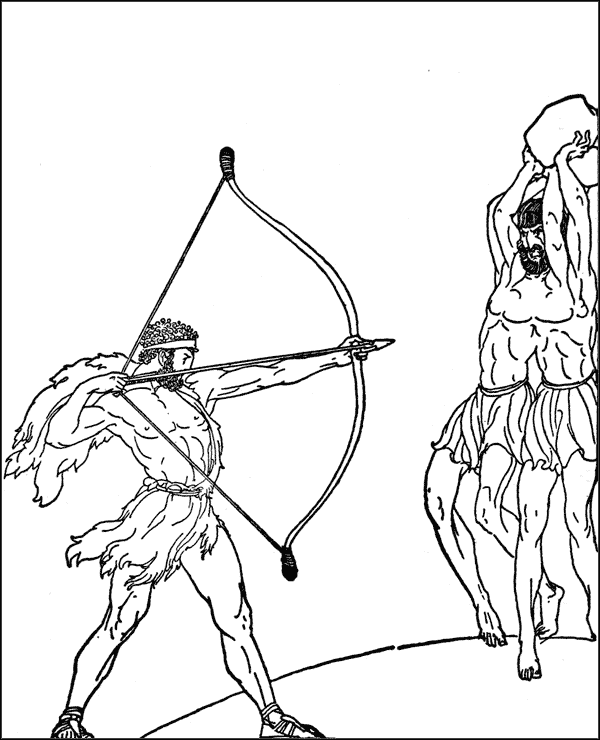 Afterward there came, one after the other, two who were famous for their hunting. No two could be more different than these two were. The first was Arcas. He was dressed in the skin of a bear; he had red hair and savage-looking eyes, and for arms he carried a mighty bow with bronze-tipped arrows. The folk were watching an eagle as he came into the city—an eagle that was winging its way far, far up in the sky. Arcas drew his bow, and with one arrow he brought the eagle down.