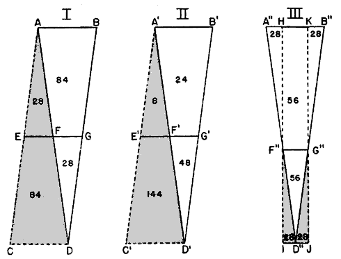 If the field of observation were cylindrical in shape, if it had parallel sides, if its projection were a rectangle or a parallelogram, the height at which birds are flying would not be a factor in finding out their number. Then the sample would be of equal breadth throughout, with an equally wide representation of the flight at all levels. Since the field of observation is actually an inverted cone, triangular in section, with diverging sides, the opportunity to detect birds increases with their distance from the observer. The chances of seeing the birds passing below an elevation midway to the flight ceiling are only one-third as great as of seeing those passing above that elevation, simply because the area of that part of the triangle below the mid-elevation is only one-third as great as the area of that part above the mid-elevation. If we assume that the ratio of the visible number of birds to the number passing through the density plane is the same as the ratio of the triangular section of the cone [Pg_388] to the total area of the plane, we are in effect assuming that the density plane is made up of a series of triangles the size of the sample, each intercepting approximately the same number of birds. We are assuming that the same number of birds pass through the inverted triangular sample as through the erect and uninvestigable triangle beside it (as in Figure 11, Diagram II). In reality, the assumption is sound only if the altitudinal distribution of migrants is uniform.