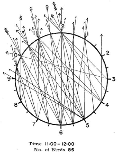 The first step in processing a set of data so obtained is to blue-pencil all entries that, judged by the accompanying remarks, relate to extraneous objects such as insects or bats. Next, horizontal lines are drawn across the data sheets marking the beginning and the end of each even hour of observation, as 8 P. M.-9 P. M., 9 P. M.-10 P. M., etc. The coördinates of the birds in each one-hour interval may now be plotted on separate diagrammatic clockfaces, just as they appeared on the moon. Tick marks are added to each line to indicate the number of birds occurring along the same coördinate. The slant of the tick marks distinguishes the points of departure from the points of entry. Figure 14 shows the plot for the 11 P. M.-12 P. M. observations reproduced in Table 1. The standard form, illustrated in Figure 15, includes four such diagrams.