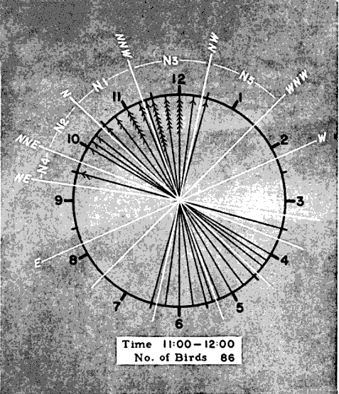 [Pg_384] Since individually computed directions are not very reliable in any event, little is to be lost by treating the observed pathways in groups. Consequently, the courses of all the birds seen in a one-hour period may be computed according to the position of the moon at the middle of the interval and expressed in terms of their general positions on the compass, rather than their exact headings. For this latter purpose, the compass has been divided into twelve fixed sectors, 22½ degrees wide. The trends of the flight paths are identified by the mid-direction of the sector into which they fall. The sectoring method is described in detail in the section on procedures.