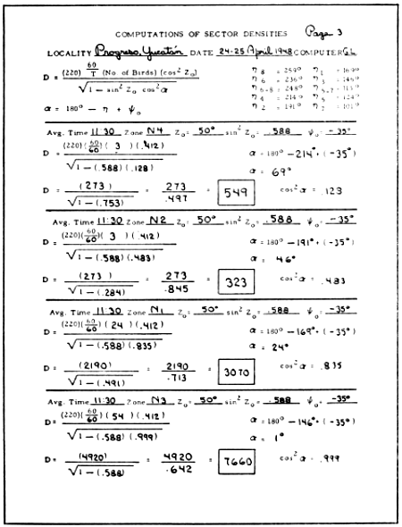 When the count of birds in the cone of observation is used as a sample to determine the theoretical number in a sector passing over such a mile line, the resulting quantity represents what I shall call a Sector Density. It is one of several expressions of the more general concept of Flight Density, which may be defined as the passage of migration past an observation station stated in terms of the theoretical number of birds flying over a one-mile line on the earth's surface in a given interval of time. Note that a flight density is primarily a theoretical number, a statistical expression, a rate of passage. It states merely that birds were moving through the effective field of observation at the rate of so many per mile per unit of time. It may or may not closely express the amount of migration occurring over an actual mile or series of miles. The extent to which it does so is to be decided by other general criteria and by the circumstances surrounding a given instance. Its basic function is to take counts of birds made at different times and at different places, in fields of observation of different sizes, and to put them on the statistically equal footing that is the first requisite of any sound comparison.