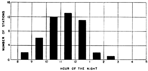 Moving northward in the valley of the Mississippi and its tributaries, we find a number of stations that yielded significantly high densities on most nights when weather conditions were favorable for migration. Louisville and Murray, Kentucky, and Knoxville, Tennessee, each show several nights with many birds flying, but only Lawrence, Kansas, and Ottumwa, Iowa, had migrations that approach in magnitude the record station densities at Tampico. Indeed, these were the only two stations in the United States that produced flights exceeding the densities at Progreso, Yucatán. The densities at Lawrence are unique in one respect, in that they were extremely high in the month of March. Since there were very few stations in operation then, these high densities would be of little significance were it not for the fact that at no time in the course of this study from 1945 to the present have comparable densities been obtained this early in the migration period. Examination of the "Remarks" section of the original data sheets from Lawrence show frequent mention of "duck-like" birds passing before the moon. We may infer from these notations that a considerable part of the overhead flight was composed of ducks and other aquatic birds that normally leave the southern United States before the main body of transient species reach there. The heavy flight densities at Lawrence may likewise have contained certain Fringillidae, Motacillidae, Sylviidae, and other passerine birds that winter mainly in the southern United States and which are known to begin their return northward in March or even earlier. Observations in 1948 at Lawrence in April were hindered by clouds, and in May no studies were attempted. However, we do have at hand two excellent sets of data recorded at Lawrence on the nights of May 3-4 and May 5-6, 1947, when the density was also extremely high.
