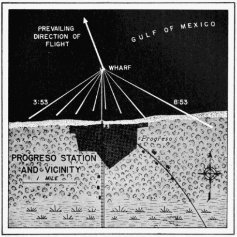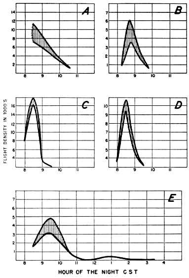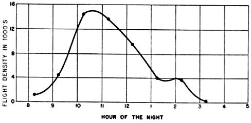 Attention has been drawn already to the nature of the nightly flights at stations immediately inland from the Gulf coast, where densities decline abruptly well before midnight. I have suggested that this early drop-off is mainly a result of the small amount of terrain south of these stations from which birds may be contributed to a night's flight. At Oak Grove, Louisiana, the flight exhibited a strong directional trend with no significant aberrant components. Therefore, one may infer that a considerable part of the flight was derived from regions to the south of the station.