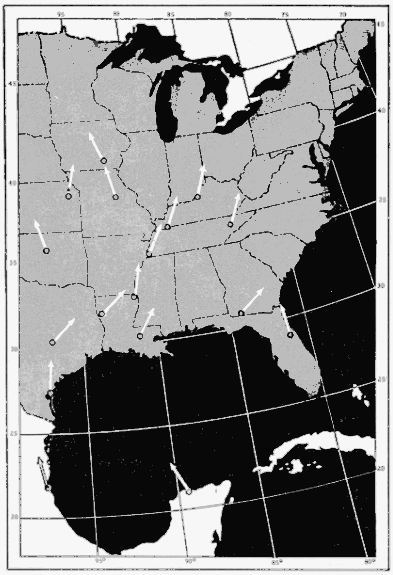 In April and May a high pressure area prevails over the region of the Gulf of Mexico. As the season progresses, fewer and fewer [Pg_458] cold-front storms reach the Gulf area, and as a result the high pressure area over the Gulf is more stable. Since the winds move clockwise around a "high," this gives a general northwesterly trajectory to the air currents in the vicinity of the Yucatán Peninsula. In the western area of the Gulf, the movement of the air mass is in general only slightly west of north, but in the central Gulf states and lower Mississippi Valley the trend is on the average northeasterly. In the eastern part of the Great Plains, however, the average circulation veers again slightly west of north. The over-all vector resultants of bird migration at stations in 1948, as mapped in Figure 39, correspond closely to this general pattern.