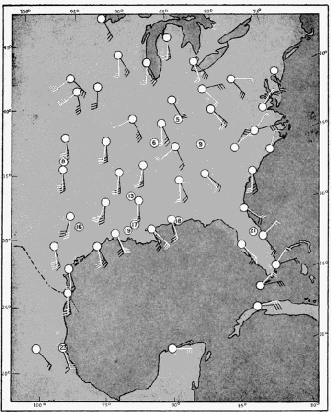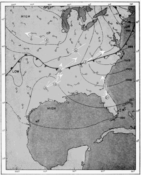 The approach employed has been to plot on maps sector vectors and vector resultants that express the directional trends of migration in the eastern United States and the Gulf region, and to compare the data on these maps with data supplied by the U. S. Weather Bureau regarding the directions and velocities of the winds, the location of high and low pressure areas, the movement of cold and warm fronts, and the disposition of isobars or lines of equal pressure. It should be borne in mind when interpreting these vectors that they are intended to represent the directions of flight only at the proximal ends, or junction points, of the arrows. The tendency of the eye to follow a vector to its distal extremity should not be allowed to create the misapprehension that the actual flight is supposed to have continued on in a straight line to the map location occupied by the arrowhead.
