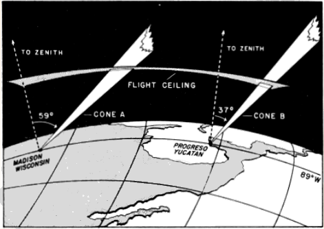 Nor does the moon suit our convenience by behaving night after night in the same way. On one date we may find it high in the sky between 9 and 10 P. M.; on another date, during the same interval of time, it may be near the horizon. Consequently, the size of the cone is different in each case, and the direct comparison of flights in the same hour on different dates is no more dependable than the misleading comparisons discussed in the preceding paragraph.